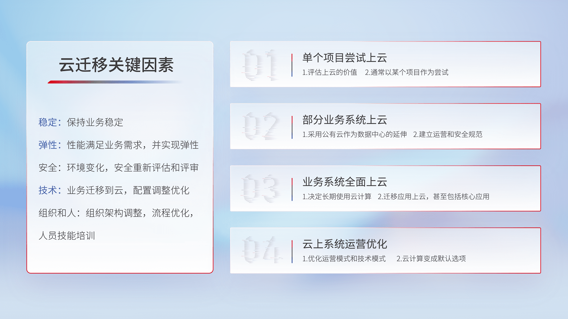 结合实际业务,,,,从规划设计、、云平台选型、、云原生改造、、、、数据迁移、、、、集成交付,,,,迁移全过程为客户识别最佳上云路径,,,做好风险识别管理,,设计网络架构、、身份权限、、、、安全审计合规、、、、操作审计、、、日志审计、、监控告警策略、、、、多站点容灾设计等,,,,对云上基础设施进行整体规划,,,提升IT治理水平,,以满足弹性、、高可用、、、、高性能的需求。。。。