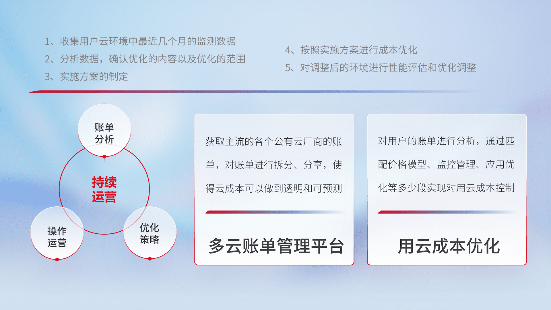 通过多云纳管,,,以统一的资源数据模型把客户的云资源进行抽象和封装,,,,进而实现对多云资源的统一操作,,,,保障云资源管理的可靠性、、、稳定性与可用性。。。量身定制化运维内容,,,配置、、、、开发运维、、补丁管理、、、备份、、、监控、、、认证和访问管理、、、审计和日常巡检等,,,,保障在用云过程中的可靠度,,稳定度以及高可用率。。。